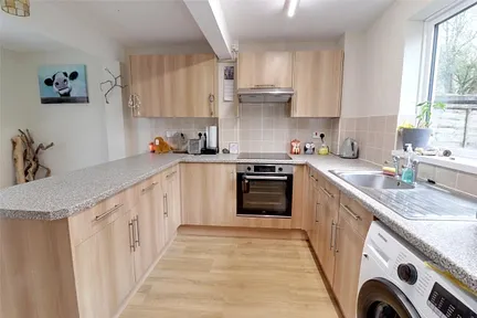 Inside the property, on entering into a small lobby there are ascending stairs to the first floor and doors opening to both the ground floor rooms. The comfortable sitting room enjoys a stone clad feature fireplace currently set up to accommodate an electric heater. The kitchen/dining room is fitted with wood effect units situated both above and below a roll top working surface and tiled splashback. There is a matching breakfast bar and the electric cooker, hob and extractor fan are included within the sale. There is a door leading out to the garden.