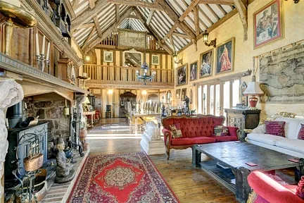 At one end a hidden stair case leads to a first-floor double bedroom with en-suite bathroom and further additional living area on the second floor overlooking the main reception hall.