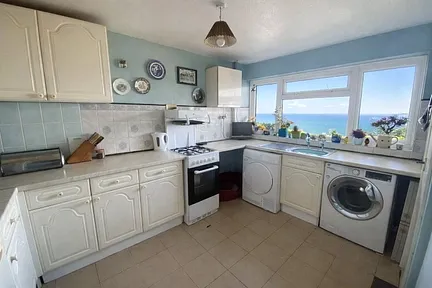 The kitchen is fitted with a range of cupboards and provides space and plumbing for a washing machine, along with space for a gas cooker. The combi boiler is also located here. From both the kitchen and the double bedroom, there are stunning views across the Bristol Channel, creating a wonderful coastal backdrop.