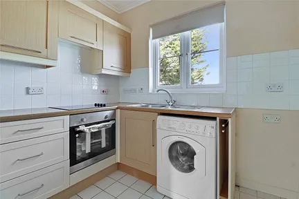 Inside, the apartment features an inviting entrance hall, a bright and comfortable living/dining area, and a neatly arranged kitchen equipped with a selection of wall and base units, ample work surfaces, a sink/drainer, integrated oven and hob, and space for further appliances.