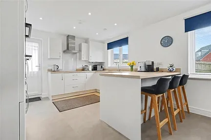 To the rear of the property, overlooking the garden, is a fantastic and spacious open-plan kitchen, dining and living area, presented in immaculate decorative order throughout. The kitchen is fitted with a range of modern wall and base units and benefits from an integrated fridge freezer, eye-level oven and grill, and an induction hob, with all appliances unused and offered in as-new condition. There is also a door leading out from the kitchen to a lovely patio area. Upon entering the room, the living area is positioned to the right, providing ample space for sizeable furniture and featuring French doors that open directly onto the delightful rear garden.
