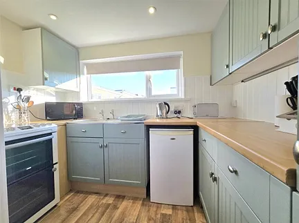 The accommodation comprises an inviting open-plan kitchen/living/dining room, finished with attractive wood-effect vinyl flooring. Sliding uPVC doors open onto a raised seating terrace, perfectly positioned to enjoy al-fresco dining or to simply relax with a glass of wine while taking in the beautiful sunsets over the Atlantic Ocean.