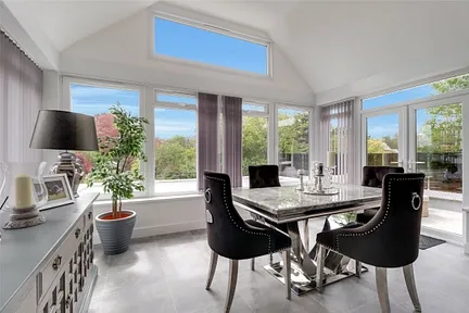 Overlooking the driveway there is a spacious paved balcony which offers a large seating area with room for ample garden furniture. Enclosed by an elegantly crafted, tinted glass balustrade offers a serene retreat for relaxation. An ideal spot to unwind after a long day with a glass of wine and watch the sun setting over the river, or indulging in alfresco dining. There is also potential to expand the balcony area that stretches the length of the dining room and would offer more space for tables and chairs.