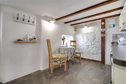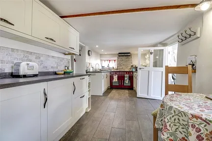 Offering comfortable two-bedroom accommodation, the cottage retains many original features such as an inglenook-style fireplace with a bread oven, exposed beams, and window seats. The sitting room and dining room lead into a spacious, double-aspect kitchen/breakfast room, recently updated with quality fitted units, stone-tiled splashbacks, and a Rangemaster cooker. A charming garden room at the rear opens to the gardens with a well-appointed downstairs shower room accesed from this room.
