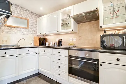 The spacious, dual aspect lounge enjoys ample space for sizeable furniture and benefits from an eye-catching open chimney breast with inset wood burning stove, alcove cabinets and shelves. A further rear door gives access to the courtyard garden.