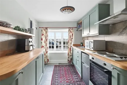 Arranged over two floors, the accommodation benefits from electric storage heating and, in brief, comprises an entrance hall with tiled flooring that flows through to a stylish modern kitchen. The kitchen is fitted with a range of base and wall units topped with timber work surfaces, a stainless-steel single drainer sink unit, integrated electric oven and hob with extractor hood, and a useful understairs storage cupboard.