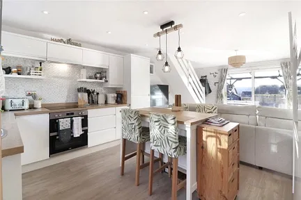 Approached from the front, the property is set behind a small terrace with a sloping garden beyond, with steps leading up to the pathway serving the terrace of homes. On entering, you are welcomed into a well-designed open-plan, double-aspect living space that works exceptionally well. The contemporary high-gloss kitchen features extensive work surfaces along with a range of integrated appliances, and opens seamlessly into the main living area. This space is positioned just off the kitchen and benefits from large sliding doors that flood the room with natural light and provide direct access onto the decked area and garden beyond — ideal for both everyday living and entertaining.