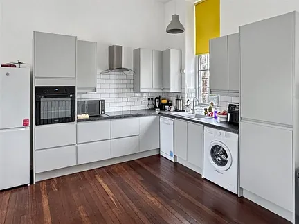 The kitchen has been recently refitted in a contemporary style, featuring sleek handleless units, contrasting work surfaces and metro-style tiled splashbacks. Integrated cooking appliances and generous storage make this a practical space for everyday use, while the open-plan arrangement provides ample room for both dining and comfortable seating areas.