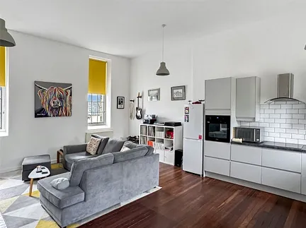 Stairs rise to the first floor where the reverse layout design really comes into its own. The open-plan living space is bright and airy, enjoying windows to both front and rear aspects which allow natural light to flow throughout the room. The high ceilings enhance the sense of space, while the exposed wooden flooring adds warmth and character.