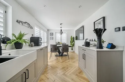 - Elegant kitchen/dining room with bifold doors opening to the garden
