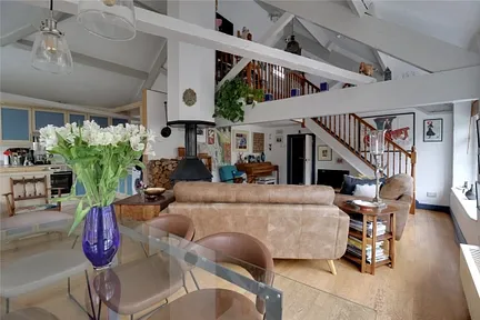 Approached through a communal entrance with staircase to first floor. The accommodation is bathed in light through large windows and includes a superb large open plan living space with vaulted beamed ceiling, woodburner, exposed floor boards and opening to a fitted kitchen. Off the reception hall there are two bedrooms and a modern fitted bathroom with shower over the bath. An open plan staircase from the sitting/dining room leads to a mezzanine study and a third double bedroom with excellent storage cupboard.
