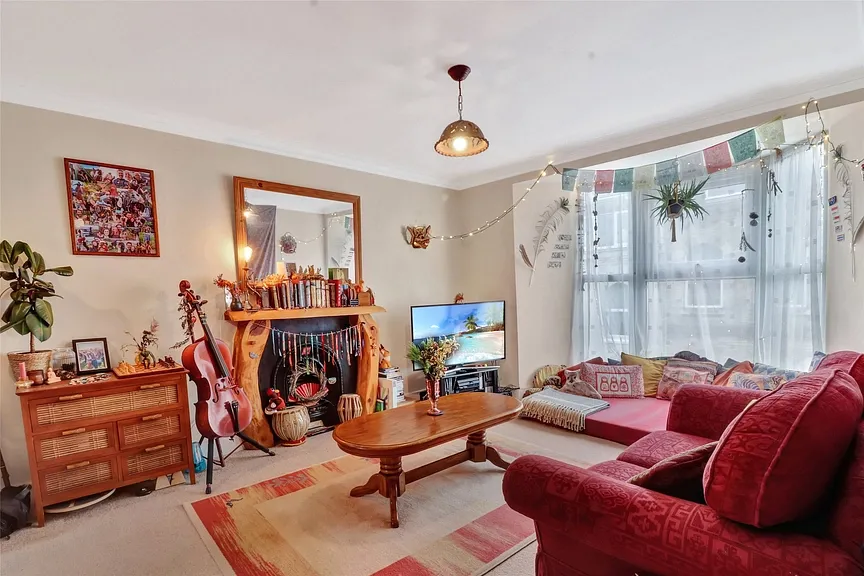 To the front is a bright and welcoming lounge, enhanced by a large bay window that floods the space with natural light. A charming cast-iron fireplace with timber surround serves as an attractive focal point. The lounge flows seamlessly into the open-plan kitchen, creating an appealing social space ideal for modern living.