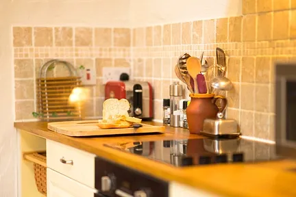 The living accommodation unfolds gradually over gentle levels, creating natural separation between spaces while preserving an open and connected feel. The kitchen and dining area form the heart of the home, combining exposed stonework and contemporary fittings to deliver both character and practicality. Steps lead down to a comfortable lounge, a cosy and tranquil setting ideal for unwinding at the end of the day, its layout enhancing the sense of charm that runs throughout the property.