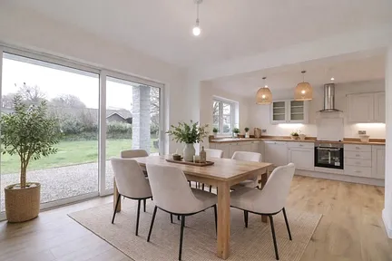 The spacious lounge is dual aspect with sliding doors opening directly onto a composite decked terrace, perfect for relaxing or entertaining. The dining area also enjoys garden access again via sliding doors, enhancing the indoor/outdoor living feel.