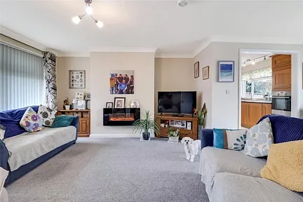 At the heart of the home is an impressive dual-aspect lounge/diner. Flooded with natural light from a large front window and French doors to the rear, it offers generous space for both relaxed seating and formal dining. The French doors open onto a raised decked area, perfect for outdoor enjoyment. An opening from the dining area leads to the spacious, well-equipped kitchen, complete with plentiful work surfaces, storage, and a built-in oven and hob.