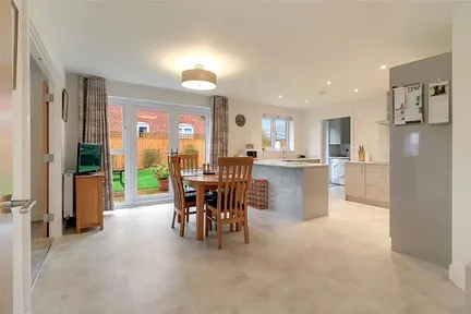At the heart of the home sits the impressive open-plan kitchen/dining room, filled with natural light and thoughtfully designed with a high-quality range of modern wall and base units, integrated fridge freezer, eye-level double oven and hob, all finished with sleek quartz worktops. Double doors open directly onto the garden, creating a seamless flow for entertaining and everyday living.