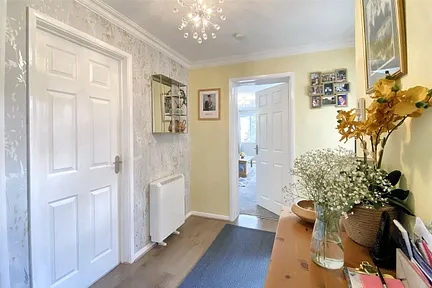 A well?equipped kitchen/dining room, complete with a range?style electric cooker and hood, provides ample space for family dining or entertaining. A door leads from here into the garden room, which works beautifully as a sunny morning space or a practical transition area for daily use. This room also gives access to the rear of the garage and out onto the elevated decking terrace.