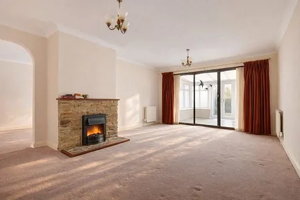Approached via driveway parking for a couple of vehicles, the property immediately feels welcoming, with a generous porch that provides the perfect practical space for coats and shoes before stepping through into a large entrance hallway that connects the accommodation beautifully. From here, to the left-hand side, you’ll find a three-piece shower room with a separate shower cubicle, ideal for day-to-day convenience and for guests. Straight ahead, double French doors open into a particularly impressive main living room, a superb size with a feature fireplace creating a cosy focal point. This space flows naturally into a large conservatory via sliding doors, where you can enjoy an outlook over the rear garden and greenery beyond, with additional French doors providing direct access outside—perfect for sunny days, entertaining, or simply relaxing and taking in the outlook.