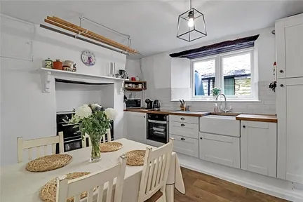 Outside, the front of the cottage is approached via steps leading to a sunny, south-facing courtyard. To the rear, there is a further courtyard space perfect for al fresco dining, along with a useful utility store equipped with plumbing for a washing machine. Shared access leads to steps ascending to a spacious rear garden—approximately 130ft—boasting far-reaching views of the surrounding countryside. On road parking can also be found nearby.