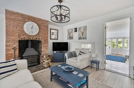 Continuing on the ground floor, the property opens into a tastefully presented living room with an inset wood-burning stove, which flows through to the versatile garden room. This provides additional living space with doors opening out to the garden. Also on this level is a family bathroom and a third bedroom, which could equally serve as a home office if required.
