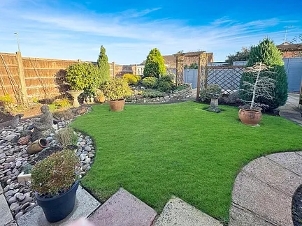 The rear of the property boasts a delightful and thoughtfully landscaped garden, designed for ease of maintenance. This includes a spacious patio extending across the full width of the house, along with an area laid to lawn, ideal for both entertaining and family use.