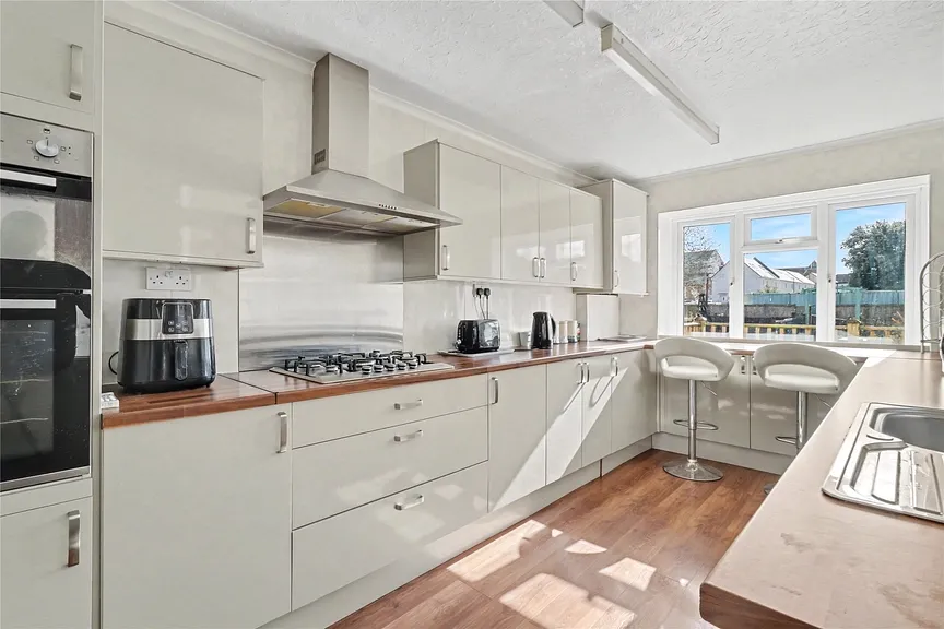 Entering the property, you are welcomed into an entrance hall leading through to a generous open-plan dining room/lounge. The lounge area is positioned to the front aspect and benefits from a large window allowing plenty of natural light, while the dining area flows through to a practical galley-style kitchen fitted with an integral oven and gas hob, along with a breakfast bar. From the kitchen there is direct access out to the rear garden.