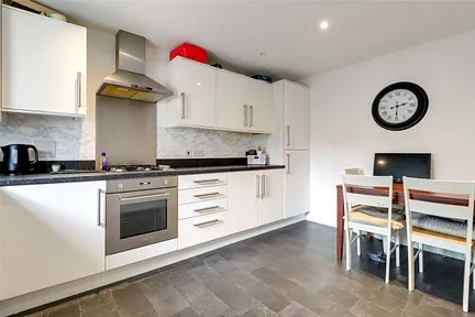 The modern, spacious open plan kitchen / dining room overlooks the front of the property and has plenty of cupboard space with base and eye level units. There is a gas hob, integrated oven, dishwasher and fridge / freezer with further space for free-standing appliances. There is also space for dining room table and chairs which makes this a very sociable space.