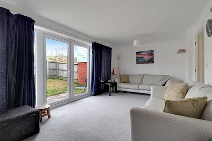 At the rear of the property, you'll find a bright and spacious lounge, offering ample room for large furniture. Expansive French doors allow natural light to pour in and provide access to the back garden.