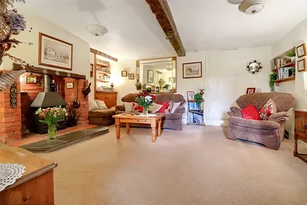 On entering the property, you are welcomed through a stable door into a generous and inviting living room. This characterful space features a striking brick chimney breast with a wood-burning stove, complemented by exposed timber beams and a part brick, part slate hearth. A useful recess to one side provides a storage cupboard, and a curved staircase with a rail leads to the first floor.