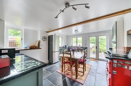 The kitchen has been recently fitted with an extensive range of wall and base units, combining a traditional country cottage aesthetic with modern conveniences. Integrated appliances are included, along with an oil-fired Rayburn. There is also a side door opening to a pleasant seating area, and plumbing is in place for a washing machine.