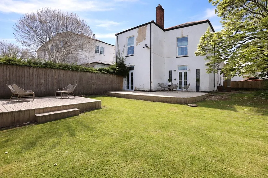 Outside is a generous rear garden offering an excellent balance of lawn and decked entertaining space, ideal for outdoor dining and relaxing. The property enjoys an attractive rear elevation with direct access from the house onto a raised decked terrace, while a second seating area provides further space to enjoy the garden. Enclosed fencing and mature trees create a pleasant sense of privacy, and the overall plot offers a bright, open outlook with plenty of room for families, guests or summer entertaining. To the other side of the home is a charming walled courtyard garden designed for low-maintenance outdoor living, with ample space for al fresco dining and entertaining.
