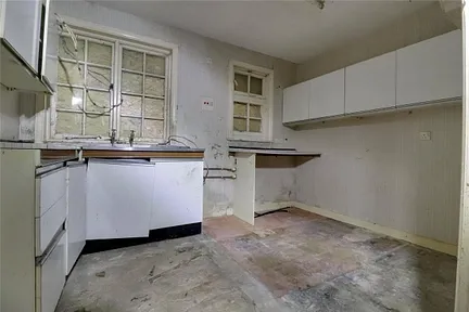 At the rear, there is a shared access strip leading to the garden, which includes a garage in need of repair and a storage shed. Though currently overgrown, the garden has potential to become a pleasant enclosed outdoor space.
