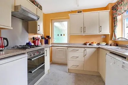 The kitchen is fitted with a range of wall and base units, providing ample storage and worktop space. It benefits from an integrated oven and gas hob, along with additional space for further appliances.