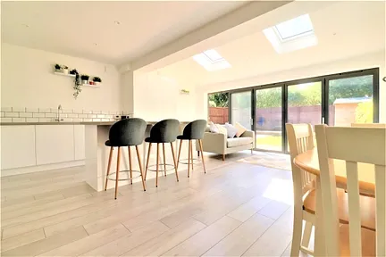 The internal accommodation comprises of an entrance hallway with storage cupboard, a dual aspect living room featuring a large front facing bay window attractive and modern gas fireplace. The kitchen and dining space has seen vast modernisation and now offers a completely open plan space with a modern fitted kitchen, white gloss suite, kitchen island and Velux windows completed with bifold indoors opening the full width of the house into the rear garden. A cloakroom completes the accommodation downstairs.