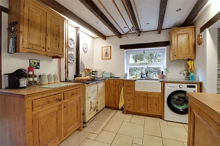 The accommodation is entered via a stable door into a welcoming entrance hall with a study area. The inviting lounge enjoys a dual aspect, with double doors opening onto the patio and an additional stable door to the side. A wood burning stove creates a warm and atmospheric focal point. The spacious kitchen and dining room is fitted with traditional units complemented by granite worktops, free standing furniture and a Belfast style sink. An oil fired Aga is also in place. A delightful sun room, added in recent years, overlooks the rear garden and provides a peaceful space in which to relax. A shower room with WC completes the ground floor.