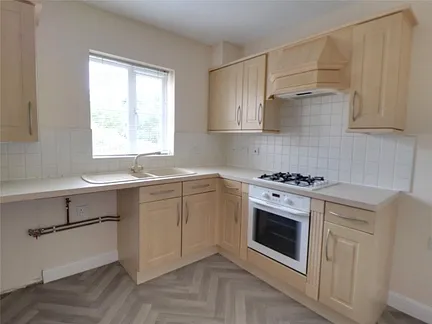 The stylish fitted kitchen offers a range of wall and base units, an inset sink and drainer, an integrated electric oven with four-ring gas hob and extractor hood above, and space and plumbing for a washing machine. A double glazed window overlooks the front garden. The generously sized living/dining room is light and airy, featuring double glazed French doors that open onto the rear garden and an under-stairs storage cupboard.