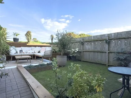 Outside, the private rear garden is laid for ease of maintenance with access to the garage and a gated driveway. The garage features a remote-controlled door to the front and a pedestrian door to the rear, with parking for up to three cars on the driveway.