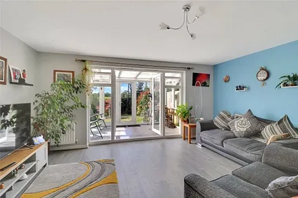 Inside, the kitchen is well-equipped with a range of wall and base units, a double oven, integrated dishwasher and fridge/freezer, and spot lighting. It opens seamlessly into a spacious, dual-aspect lounge/dining room, which benefits from under stairs storage and flows into a bright conservatory—an ideal additional living space with direct access to the rear garden.