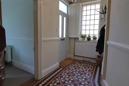 Upon entering the property via the glazed composite front door, a large entrance porch laid with original Minton floor tiles is a useful area for storing coats, boots and shoes. It is here where the downstairs WC can be found under the main staircase. The lounge has a large bay window which enjoys views over the town towards the Torrs. There are plenty of character features with coving, picture rails and an open ornate fireplace with decorative surround tiles and mantelpiece .
