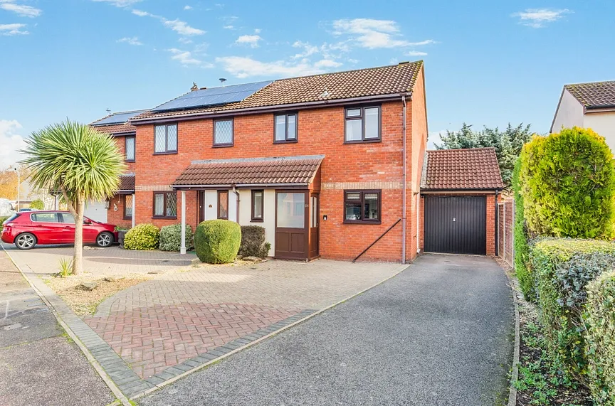 To the front, the property is approached via a driveway providing ample off-road parking, leading to the front door with outside light and the single garage. With an up-and-over door, eaves storage, and power and light. From shed with power and light, which provides access into the rear garden. The rear garden is fully enclosed by timber fencing, with a patio seating area and a level lawn, offering easy low maintenance and a private outdoor retreat.