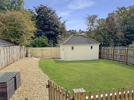 Externally, the property has a generous rear garden with raised decking, patio and a large lawn, together with direct access onto the Camel Trail, a rare lifestyle feature perfect for walkers and cyclists. At the foot of the garden is a detached garage with its own gated access, providing secure parking or scope for conversion subject to consents. The front offers ample driveway parking for several vehicles.
