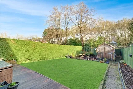 - Generous sunny rear garden with decking and shed, plus driveway parking for 2–3 vehicles