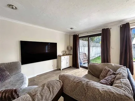 The kitchen is fitted with base and eye level units, integrated oven and hob, and space for appliances. The living/dining room is spacious with sliding doors to the rear patio.