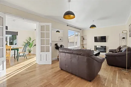 Returning to the main hallway, the rear of the property features a generously sized lounge/diner overlooking the fully enclosed south-facing rear garden. Flooded with natural light, this space is ideal for both everyday living and entertaining. From here, is an additional reception room, which offers flexible use as a snug, formal dining room, or home office, and also enjoys pleasant views across the garden.