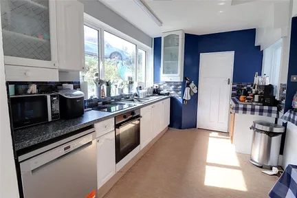 Entering into the welcoming entrance hall, the living room is spacious with a large bay window and feature tiled fireplace. The kitchen is formed from an extension and has good selection of light coloured cupboards situated both above and below a splashback and the roll top working surface, with an electric hob. This leads into the original dining room with plenty of room to accommodate a table and chairs with patio doors leading out into the garden. A shower room/utility room completes this level.