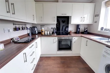 On the ground floor the kitchen is comprehensively fitted with quality appliances which include a washing machine, fridge, electric oven and induction hob along with the extractor fan over. There is a good selection of light coloured cupboards situated both above and below a wood effect roll top working surface. The separate dining room is large enough to accommodate a table and chairs. The living room is spacious with a sun room in place allowing access to the rear garden. A cloakroom/WC completes this level.