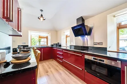 Arranged over two floors and presented in very good decorative order, the accommodation begins with an entrance porch leading into the welcoming living room, which boasts a wood-burning stove set within a characterful fireplace with red brick and stone surround. The separate dining room offers ample space for family gatherings or entertaining, flowing seamlessly into the well-appointed kitchen. The kitchen features a range of integrated appliances including a dishwasher, microwave, and double oven, complemented by beautiful marble worktops.