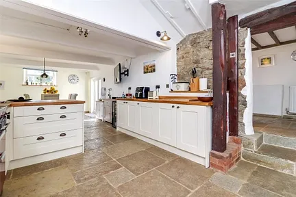 Extending to over 31 feet, this exceptional space is beautifully semi-vaulted with exposed beams and Velux-style windows, combining grandeur with everyday comfort. The kitchen is superbly appointed with an extensive range of fitted units, twin Belfast sink and wooden block worktops, while a breakfast bar and range cooker set within a central chimney breast create a natural focal point. A utility room and separate boiler room lie beyond, while at the far end, the dining and relaxed seating area opens to the garden through sliding doors. Solid stone flooring and underfloor heating complete this outstanding heart of the home.