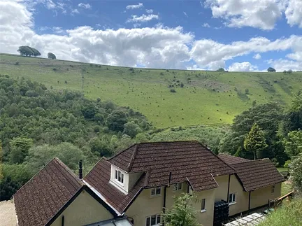 Nestled into the hillside the property stands in total within some c. 2.6 acres of garden, land and woodland. There are a number of access paths through the several parcels of woodland and mature grass areas to the front. There is also a stream fed pond.