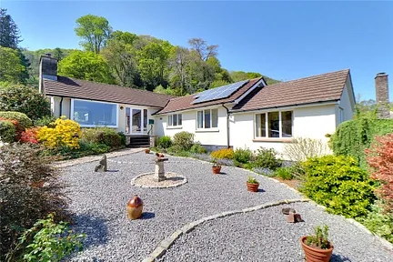 The property is approached over a private road serving six properties and off which is a single garage and a brick paved parking area for two further vehicles. To the front of the property there is an enclosed garden of ornamental gravel with shaped flower and shrub borders, specimen trees and with fantastic coastal views. Immediately to the rear outside of the conservatory is a paved patio area with the gardens gently rising up to woodland. The manicured gardens are an undoubted feature of the property with sweeping lawns and an abundance of shrubs, flowers and specimen trees with meandering stone pathways in between and many areas to sit and revel in the tranquillity including a paved patio and a raised timber decked terrace.